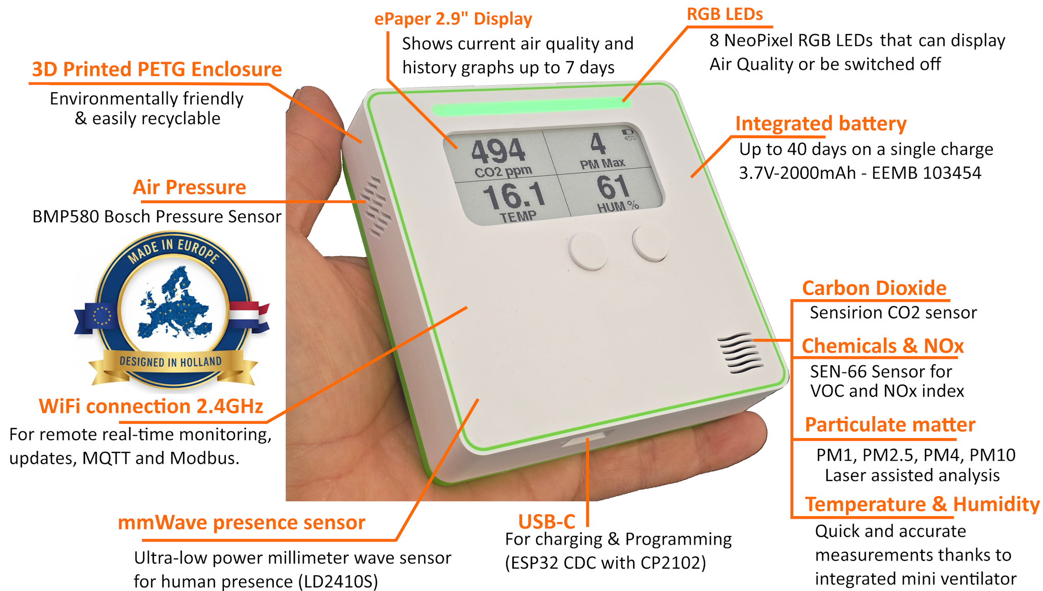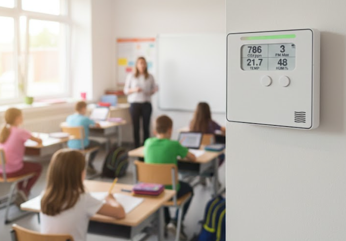 Elke unit integreert meerdere sensoren in één nauwkeurig gekalibreerde module om accurate en stabiele metingen te garanderen. Een interne micro-ventilator zuigt actief lucht door de meetkamer, wat snellere en betrouwbaardere resultaten oplevert dan elke passieve luchtkwaliteitssensor.