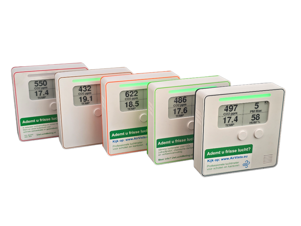 De AirVista is een luchtkwaliteits monitor die in Nederland is ontworpen en geproduceerd. Het maakt gebruik van hoogwaardige sensoren van het merk Bosch en Sensirion uit Zwitserland en heeft maar liefst 11 sensoren met Wi-Fi. De AirVista is gemaakt voor bedrijven zoals (basis) scholen, sportzalen en kantoren maar ook zeer geschikt voor mobiele (portable) metingen dankzij de ingebouwde accu en geheugen waarmee de sensor tot 40 dagen werkt.